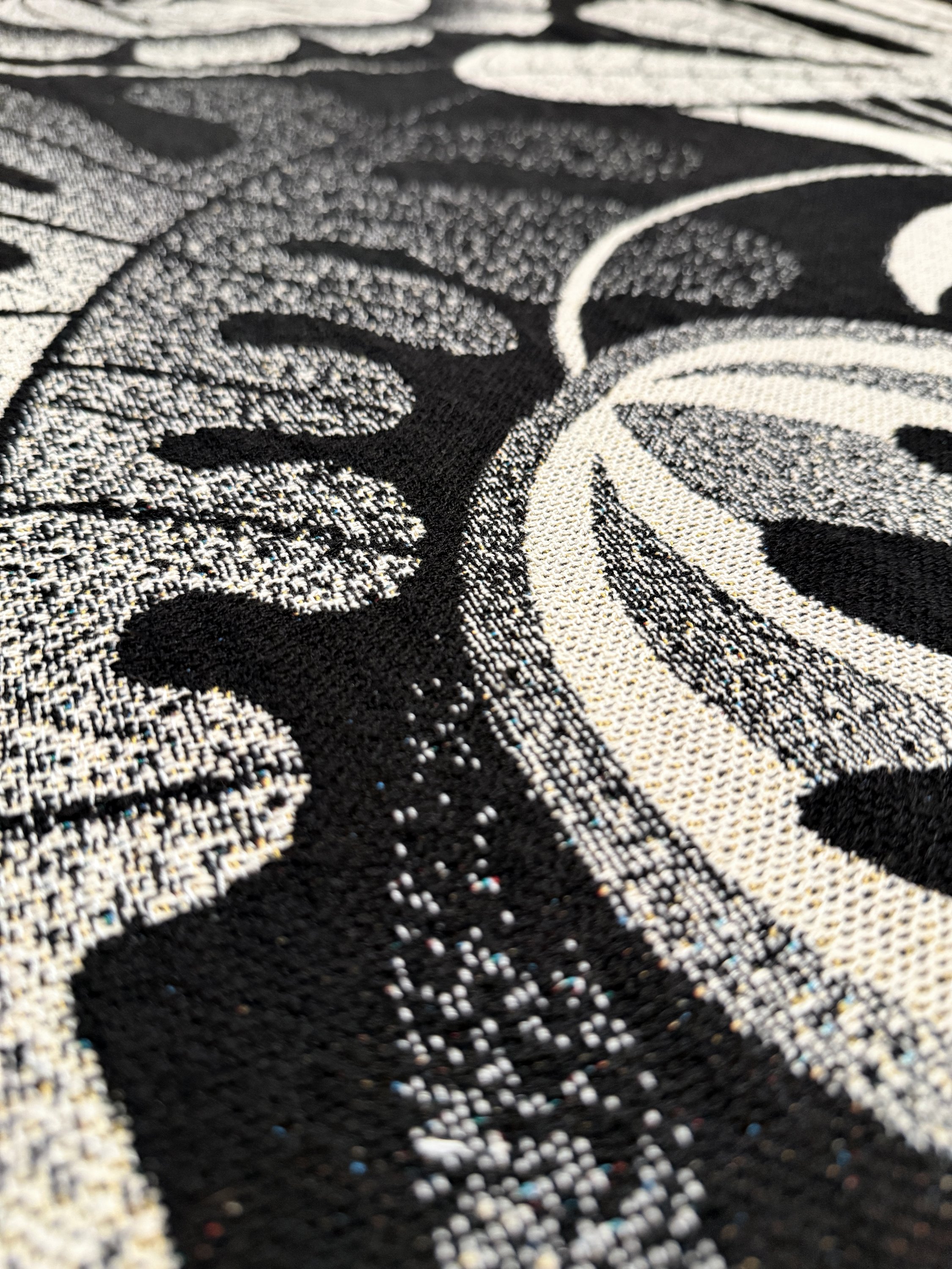 The illustration is translated into a woven texture form, where texture becomes part of the artwork itself. My signature stippling texture, built from countless small dots, is carefully woven into the fabric, allowing the process to enhance every detail. The texture comes alive with added depth, movement, and richness that can be both seen and felt.