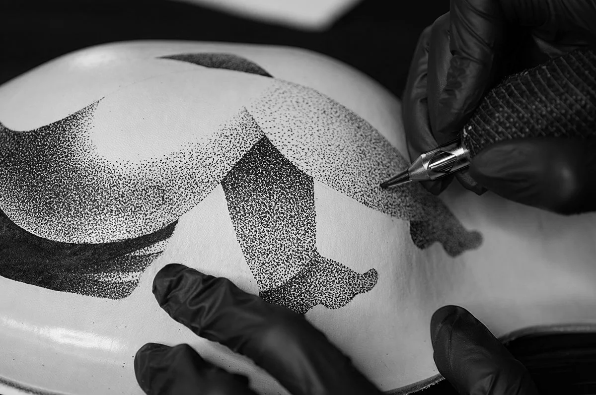 Tattooing on a leather vessel, however, is an entirely different experience. None of the interactions I have with a living canvas exist here. The material is completely different from human skin - unyielding, dry, and brittle. It eagerly absorbs every drop of ink yet remains fragile and will never heal. Working with it requires patience, sensitivity, and courage. At the same time, it offers creative freedom, limited only by its form and materiality.