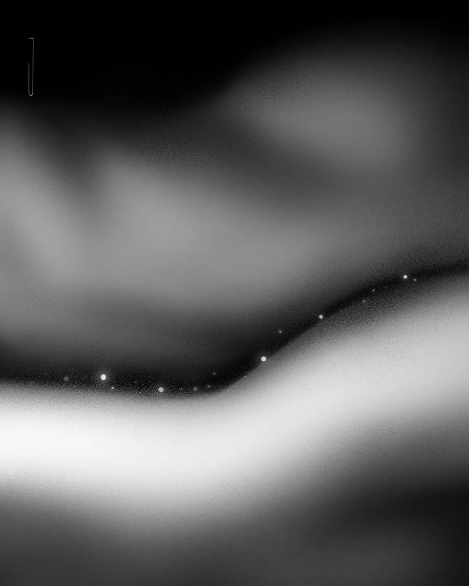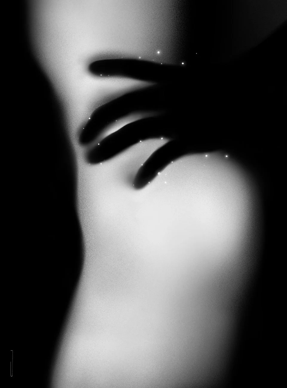 The work emerges from a dark canvas, and the bodies begin to take shape as particles of light enter and reveal them - as if uncovering my desires and passions, illuminating them from the depths of my consciousness.